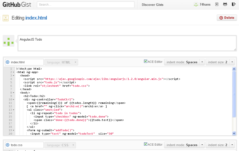 대표적인 간단한 소스코드 관리 및 블로그에 삽입하기 적당한 서비스는 JSFiddle, plnkr, Gist 다. 여기서 필자는 주로 Gist를 이용해서 블로그에 소스코드를 넣을 것이다. 특별히 Gist를 택한 이유는 Github에서 서비스 되기도 하고, 소스코드를 일목 요연하게 관리할 수 있기 때문이다. 또한 앞으로 JSFiddle, plnkr도 소스코드를 직접 실행하기 위해서 사용하게 될 것이다.